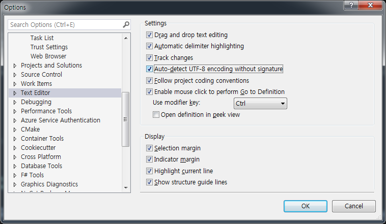 아래 메뉴에서 Auto-detect UTF-8 encoding without signature를 체크하면 오류가 사라진다